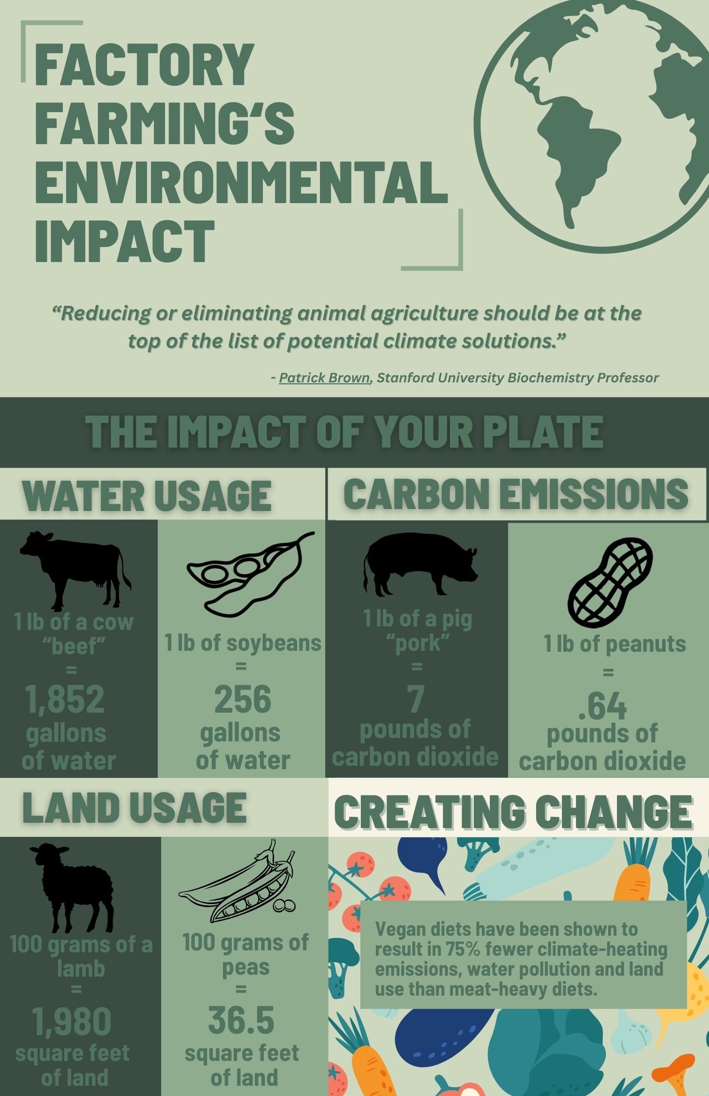 Animal agriculture requires large amounts of land and water while also contributing to high rates of greenhouse gas emissions. A vegan diet has an impactful role to play in enacting climate solutions as vegan diets result in 75% fewer climate-heating emissions than animal-heavy diets. Stanford University biochemistry professor Patrick Brown argues, “Reducing or eliminating animal agriculture should be at the top of the list of potential climate solutions.” This page offers a collection of resources on the relationship between factory farming and climate change.